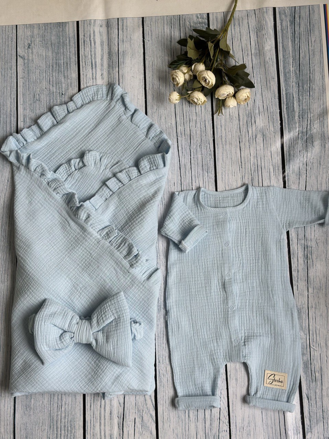 Теги: Купить детские конверты, комбинезон оптом, детские конверты на выписку оптом. 335-Г. Комплект из детского комбинезона, р 56 и конверта муслин, хлопок 100% 90/90 см, голубой цена,отзывы официальный сайт "Стеша Ипатово"