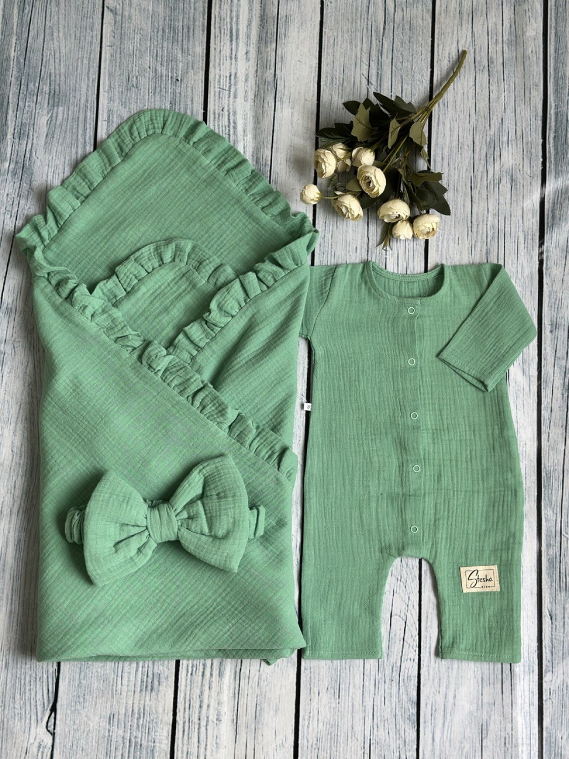 Теги: Купить детские конверты, комбинезон оптом, детские конверты на выписку оптом. 335-ОЛ. Комплект из детского комбинезона, р 56 и конверта муслин, хлопок 100% 90/90 см, олива цена,отзывы официальный сайт "Стеша Ипатово"