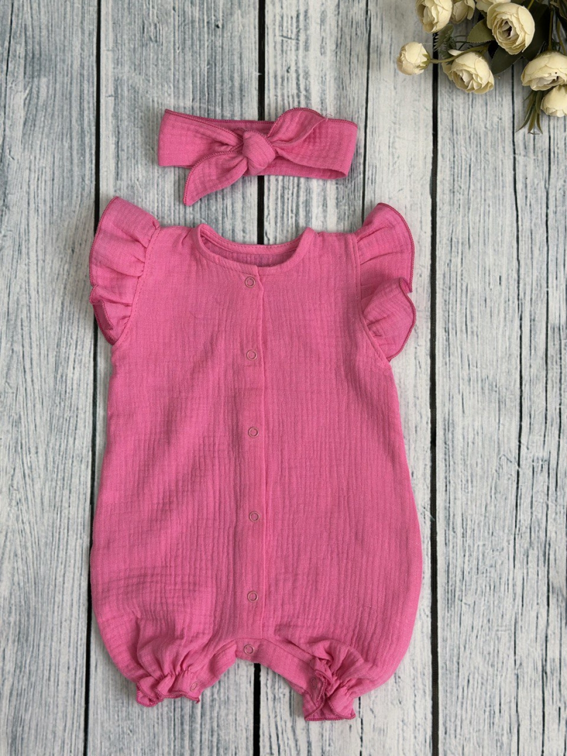 Купить оптом 341-Ф. Песочник с повязкой для девочки из муслина, хлопок 100%, р 62,68,74,80 фуксия в Ипатово